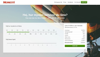Monetti är en låneförmedlare på nätet som ger alla möjligheten att låna pengar snabbt och säkert till ganska bra räntor i jämförelse med andra. Här kommer du att kunna låna mellan 1000 till 20000 kronor, och kan även välja din återbetalningstid mellan 1 upp till 10 månader beroende på lånebeloppets storlek. Du som tar ditt lån hos Monetti lånar egentligen av Folkefinans AS Norge som har filial i Sverige på Medborgarplatsen i Stockholm. Monetti startade sin verksamhet i Sverige redan 2006.